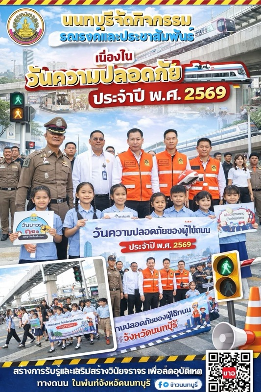 นนทบุรี – จังหวัดนนทบุรีจัดกิจกรรมรณรงค์และประชาสัมพันธ์ เนื่องใน “วันความปลอดภัยของผู้ใช้ถนน” ประจำปี พ.ศ. 2569 เพื่อสร้างการรับรู้และเสริมสร้างวินัยจราจรแก่ประชาชน มุ่งลดอุบัติเหตุทางถนนและส่งเสริมความปลอดภัยอย่างยั่งยืน