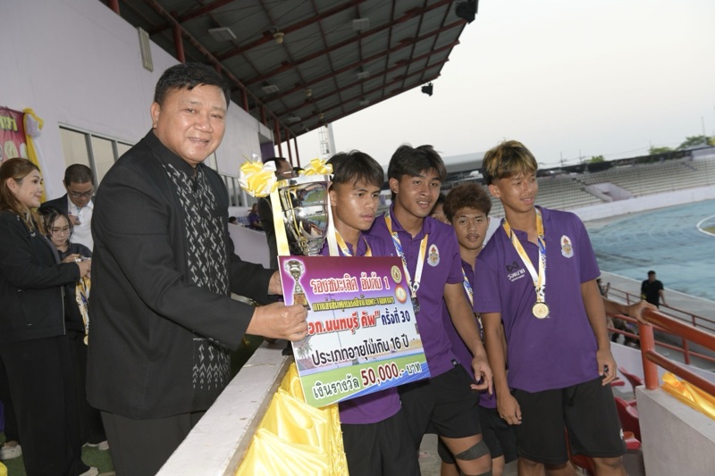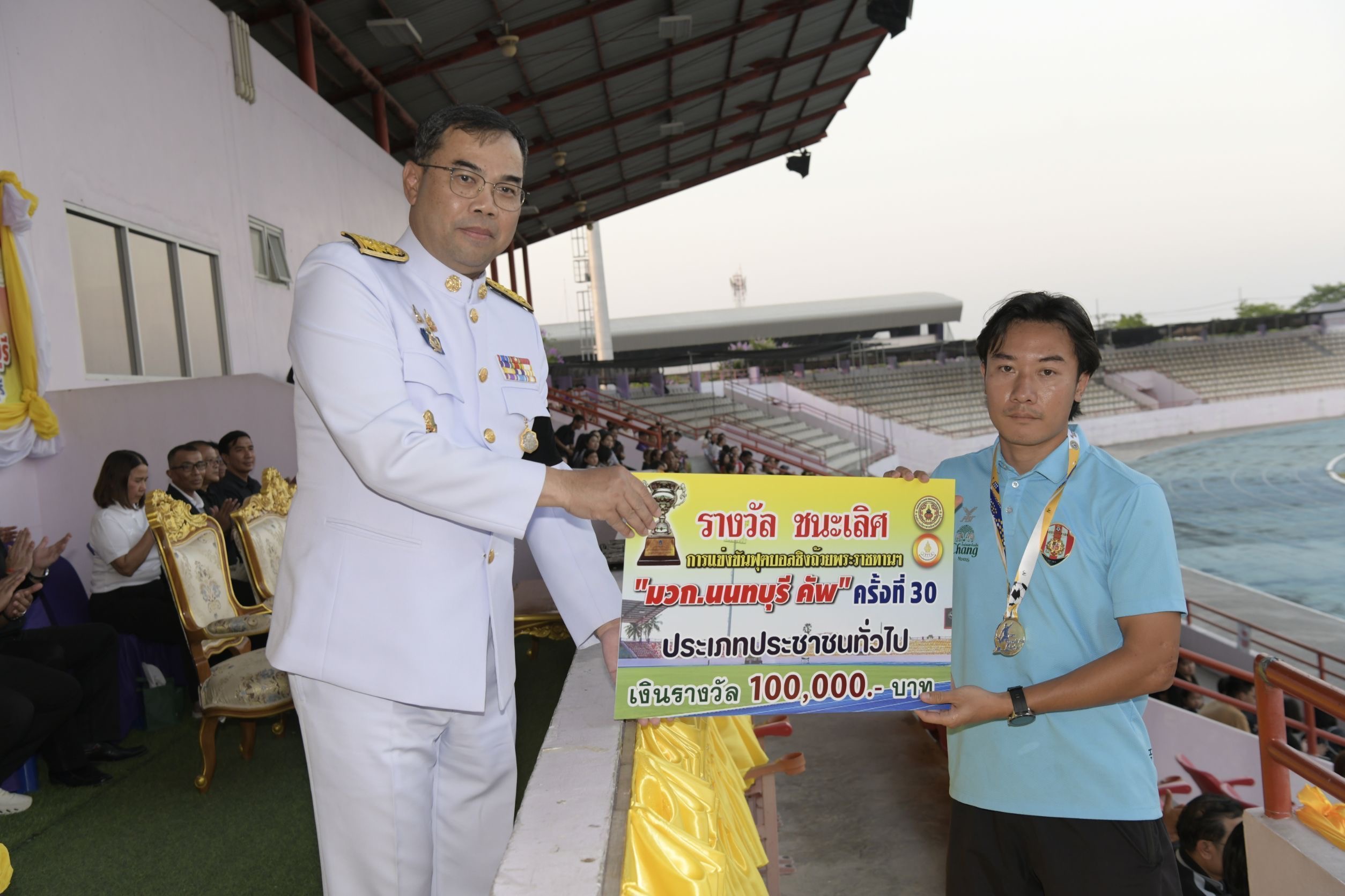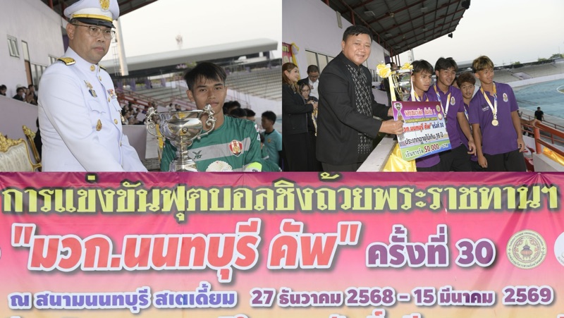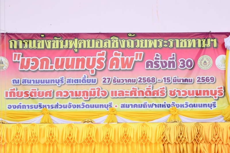วันนี้ (15 มี.ค. 69) เวลา 17.50 น. ณ สนามกีฬาจังหวัดนนทบุรี Nonthaburi Stadium นายเชษฐา โมสิกรัตน์ ผู้ว่าราชการจังหวัดนนทบุรี เป็นประธานในพิธีปิดการแข่งขันฟุตบอลชิงถ้วยพระราชทานฯ “มวก.นนทบุรี คัพ” ครั้งที่ 30 โดยมี พันตำรวจเอก ธงชัย เย็นประเสริฐ นายกองค์การบริหารส่วนจังหวัดนนทบุรี พร้อมด้วยนายอำเภอ คณะผู้บริหาร ข้าราชการ นักกีฬา และประชาชน เข้าร่วมพิธีอย่างพร้อมเพรียง