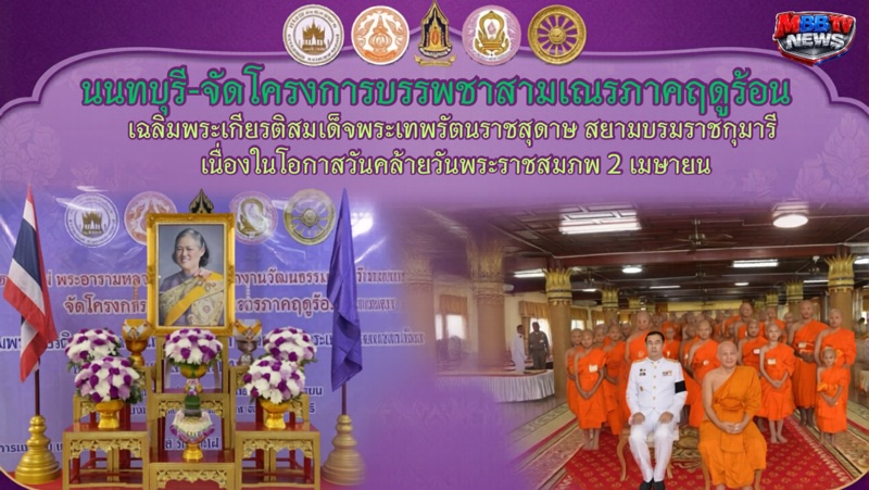 วันนี้ (1 เม.ย.69) เวลา 13.30 น. ณ วัดบางไผ่ พระอารามหลวง อำเภอบางบัวทอง จังหวัดนนทบุรี พระโสภณนนทสาร เจ้าอาวาสวัดบางไผ่ พระอารามหลวง เป็นประธานฝ่ายสงฆ์ นายเชษฐา โมสิกรัตน์ ผู้ว่าราชการจังหวัดนนทบุรี เป็นประธานฝ่ายฆราวาสในพิธีบรรพชาสามเณรภาคฤดูร้อน เฉลิมพระเกียรติสมเด็จพระกนิษฐาธิราชเจ้า กรมสมเด็จพระเทพรัตนราชสุดาฯ สยามบรมราชกุมารี เนื่องในโอกาสวันคล้ายวันพระราชสมภพ 2 เมษายน ประจำปีงบประมาณ พ.ศ. 2569 จังหวัดนนทบุรี โดยมีหัวหน้าส่วนราชการ ข้าราชการ และพสกนิกรชาวนนทบุรีเข้าร่วมพิธีอย่างพร้อมเพรียง เพื่อให้พสกนิกรชาวไทยได้แสดงความจงรักภักดีและน้อมรำลึกในพระมหากรุณาธิคุณผ่านการบำเพ็ญกุศลถวายเป็นพระราชกุศล อีกทั้งยังเป็นการปลูกฝังและพัฒนาคุณธรรม จริยธรรม และศีลธรรมให้แก่เด็กและเยาวชน เสริมสร้างความเข้มแข็งให้แก่สังคมผ่านการขัดเกลาทางศาสนาในช่วงปิดภาคเรียน